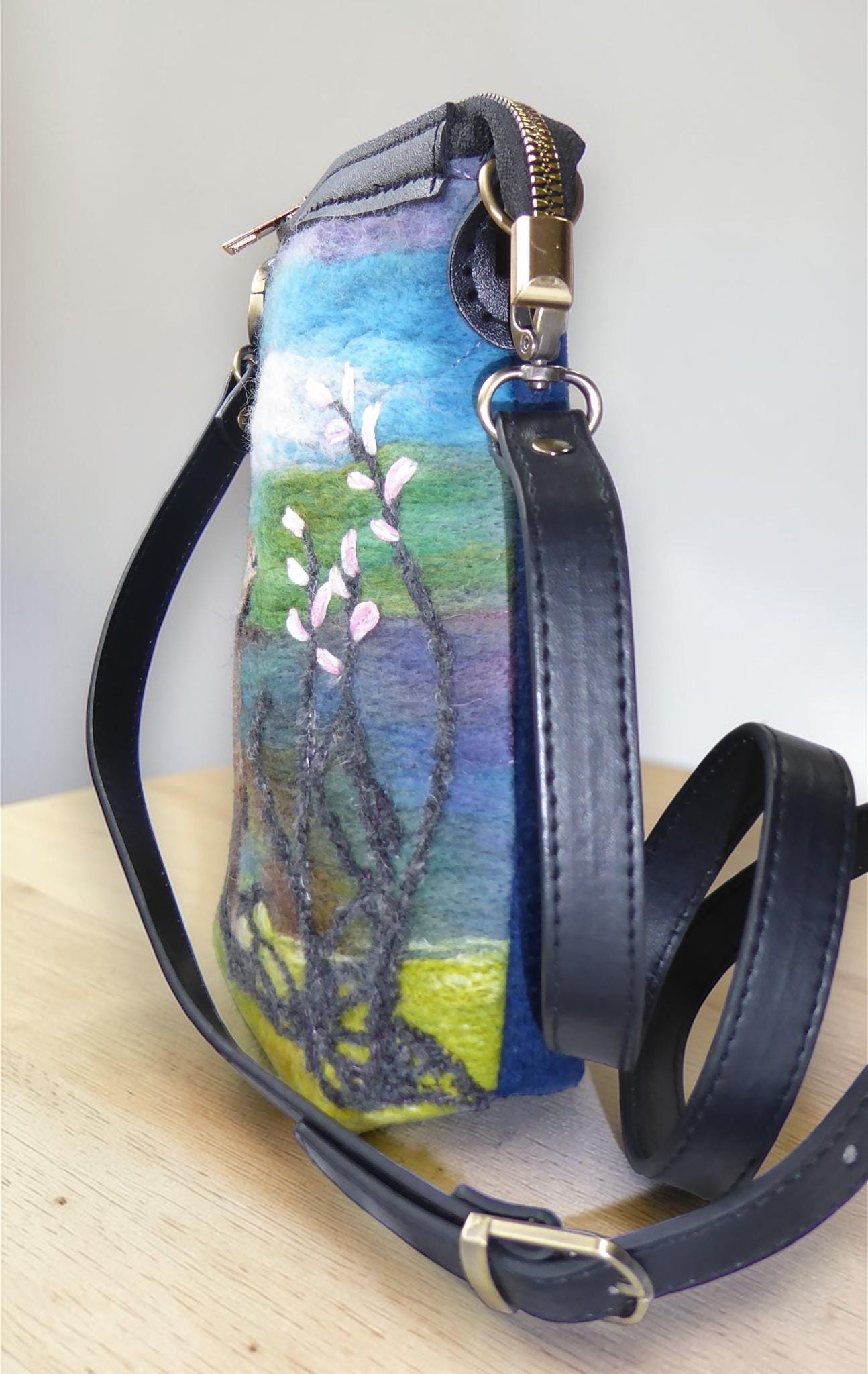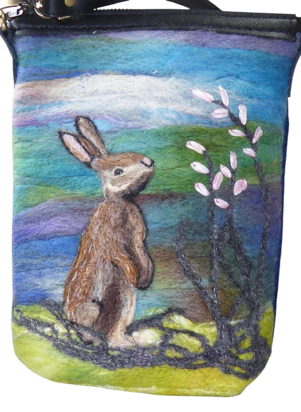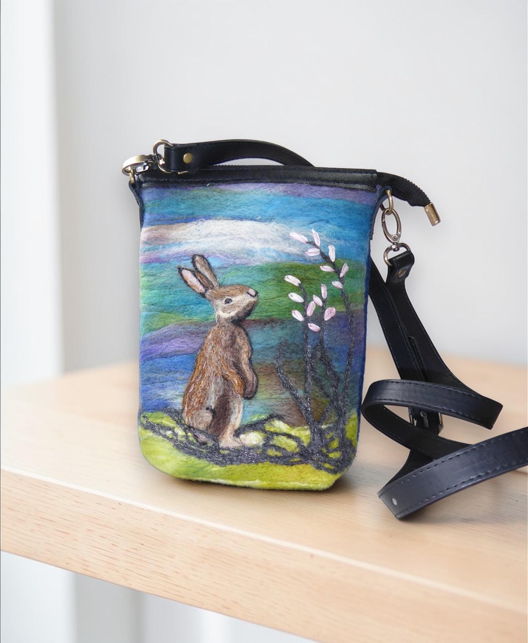 The design features a needle-felted rabbit and flowers. The fabric for this bag is our own felt.