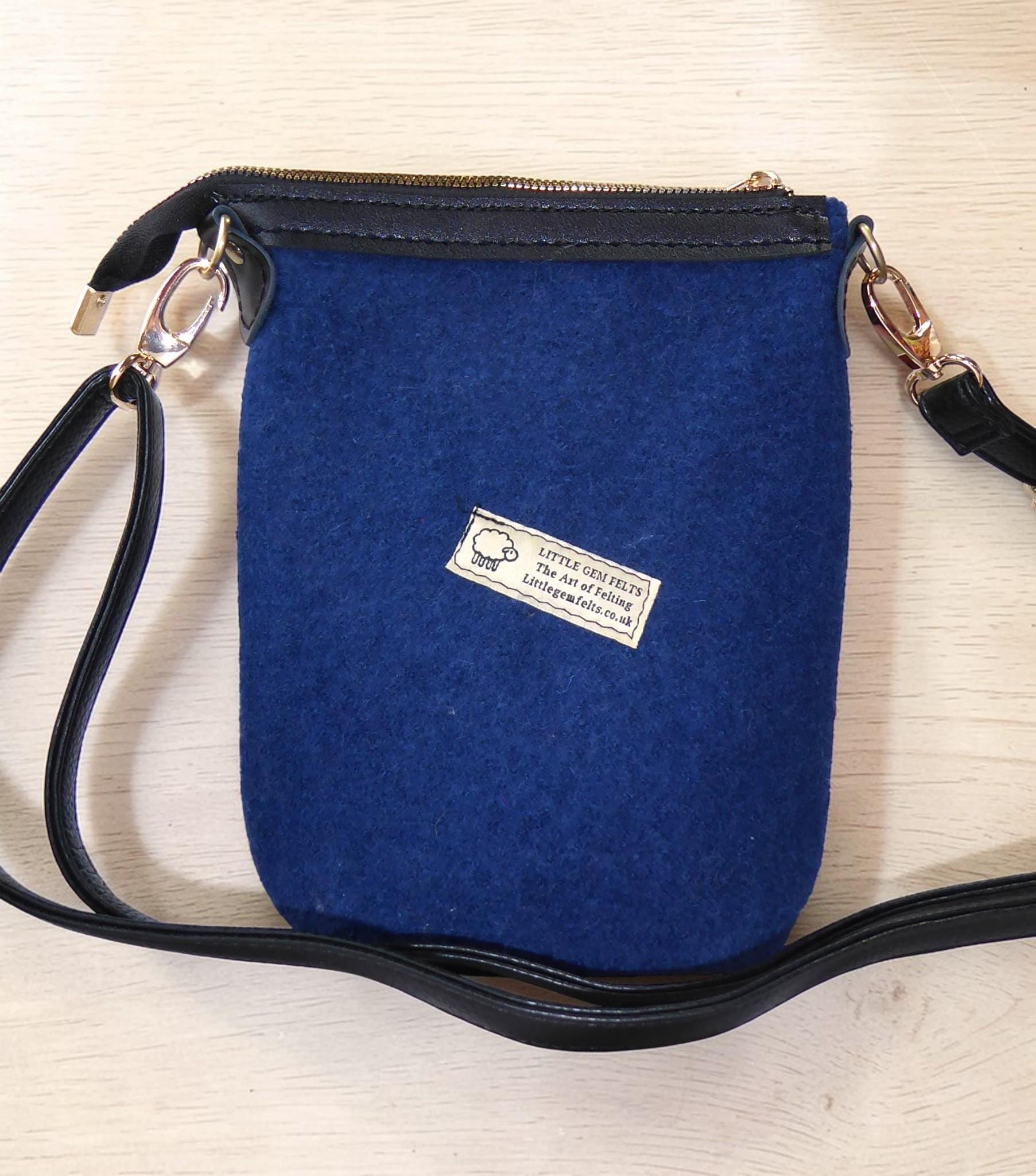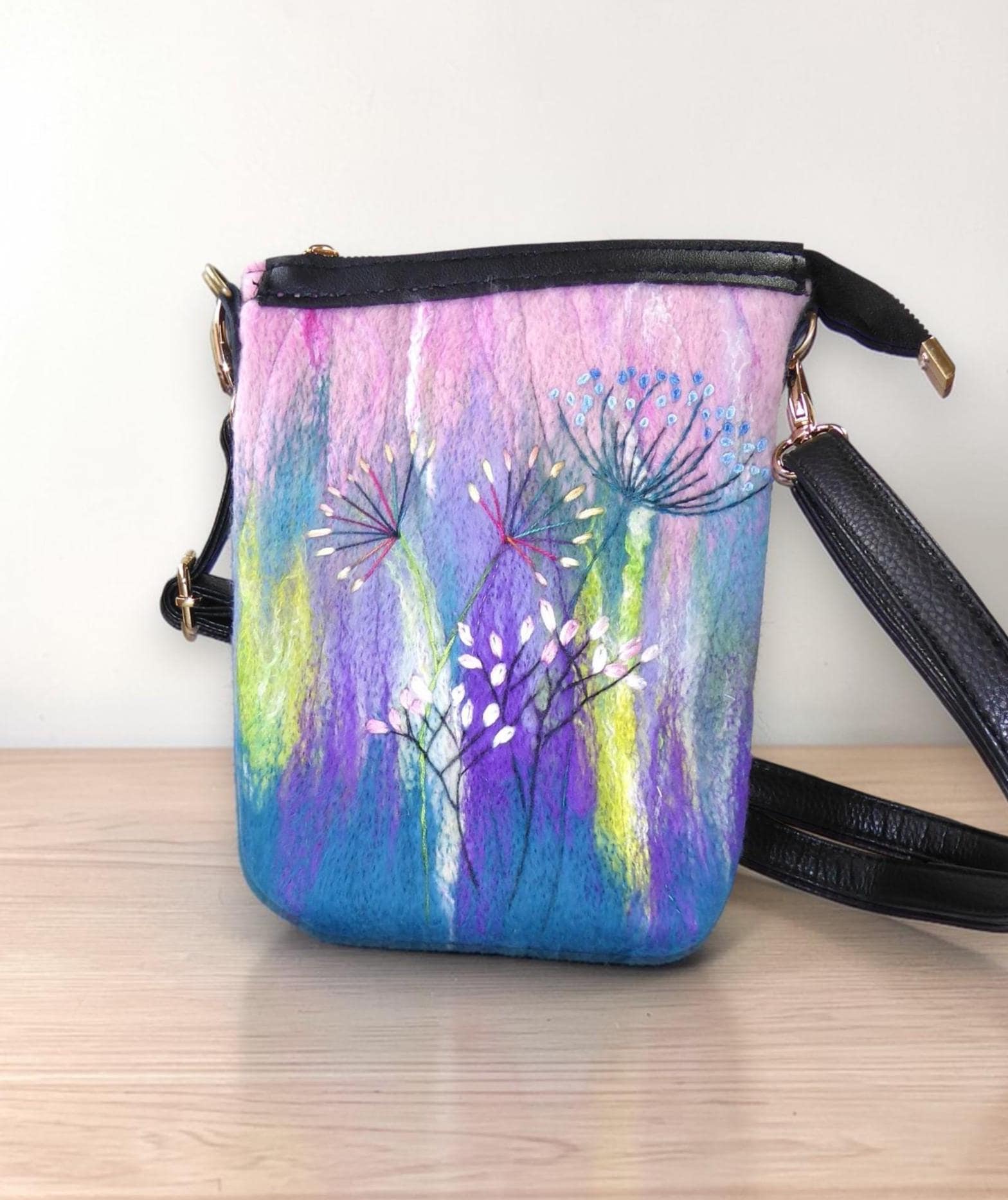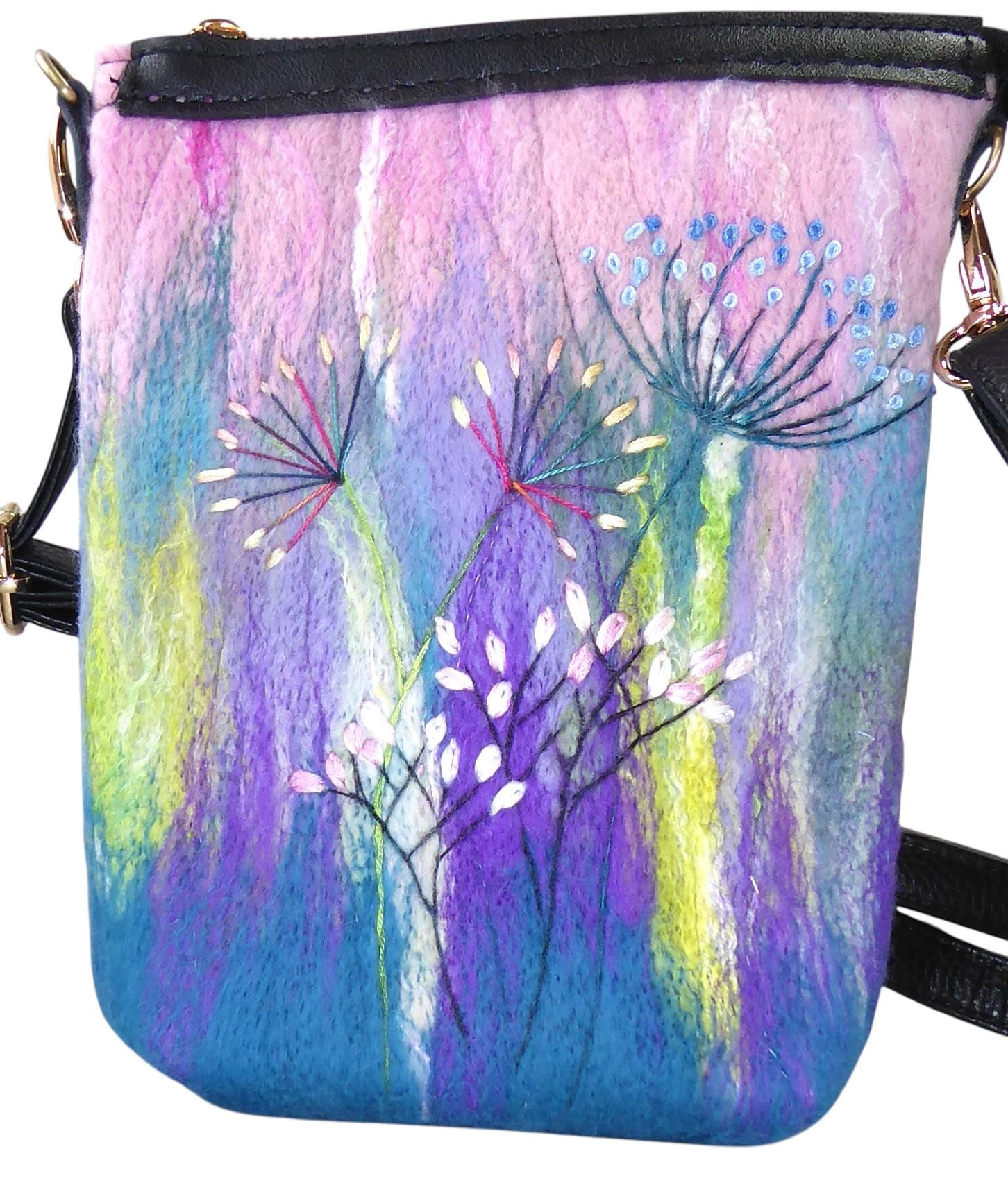 The design has embroidered flowers on a needle-felted background. The fabric for this bag is our own felt.
