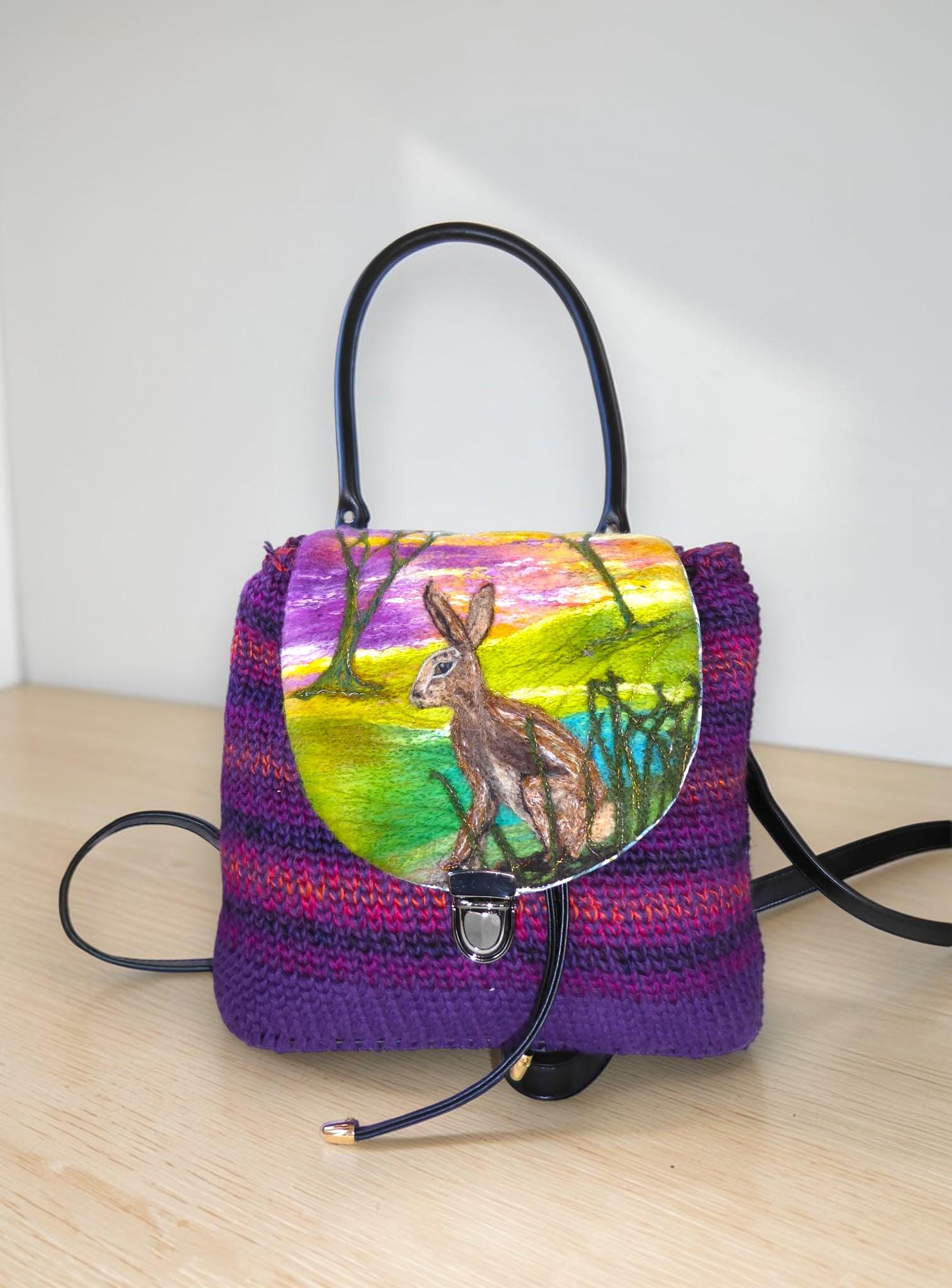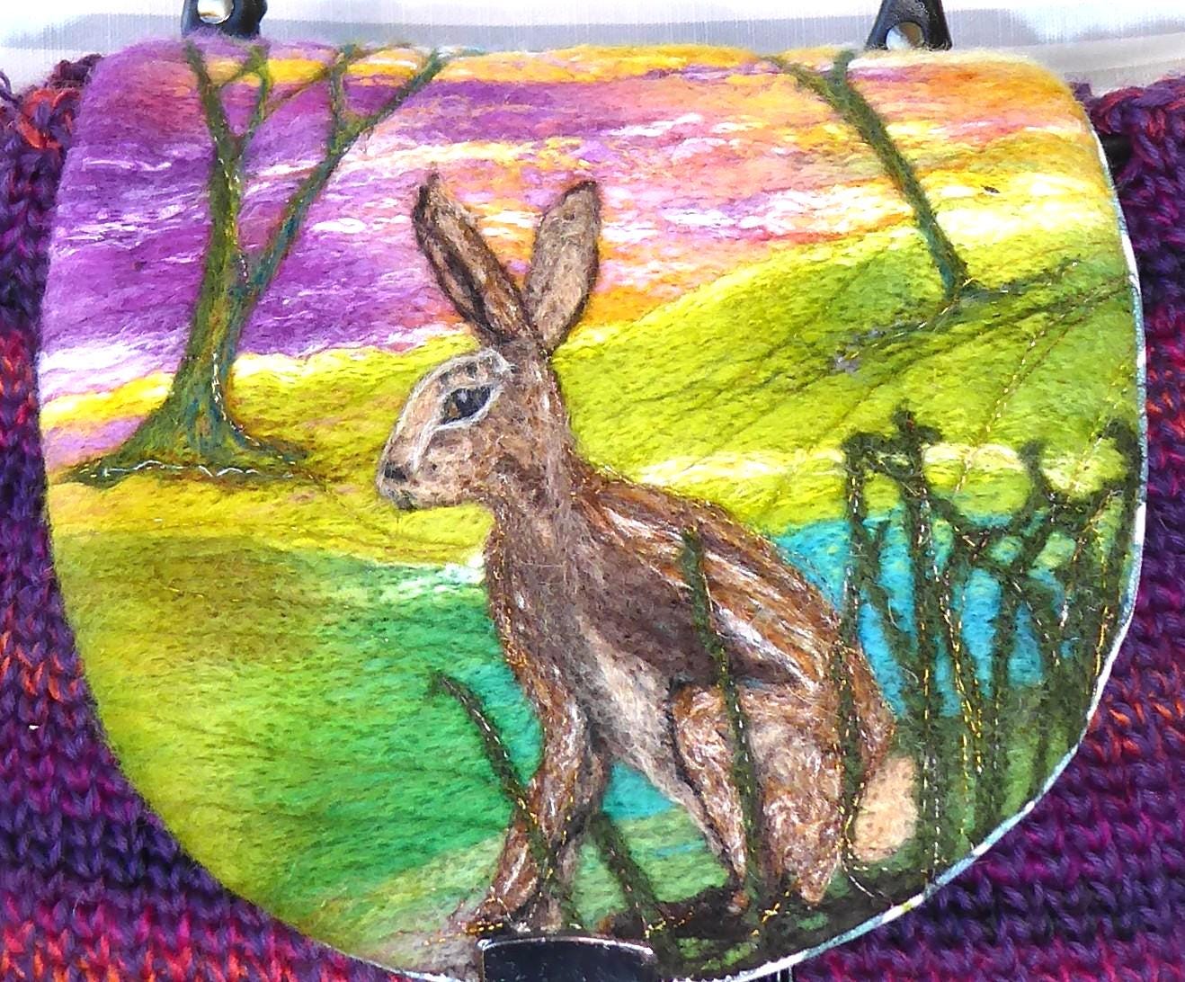 The design on the flap features a needle-felted hare on the hillside.