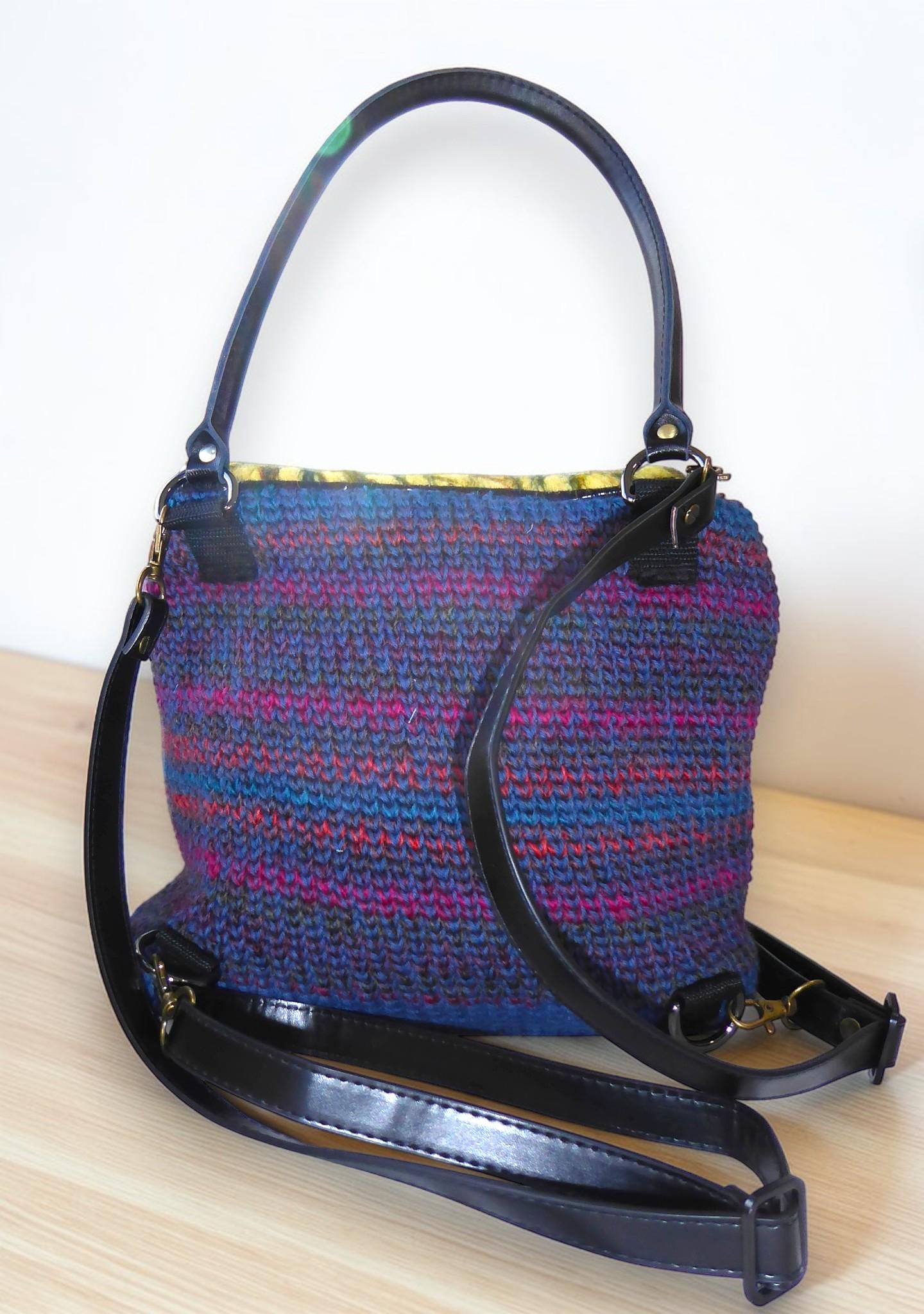 There are two black detachable P.U. leather shoulder straps, 20mm wide and extendable to 120cm. These can be reconfigured to enable the bag to be worn across the body