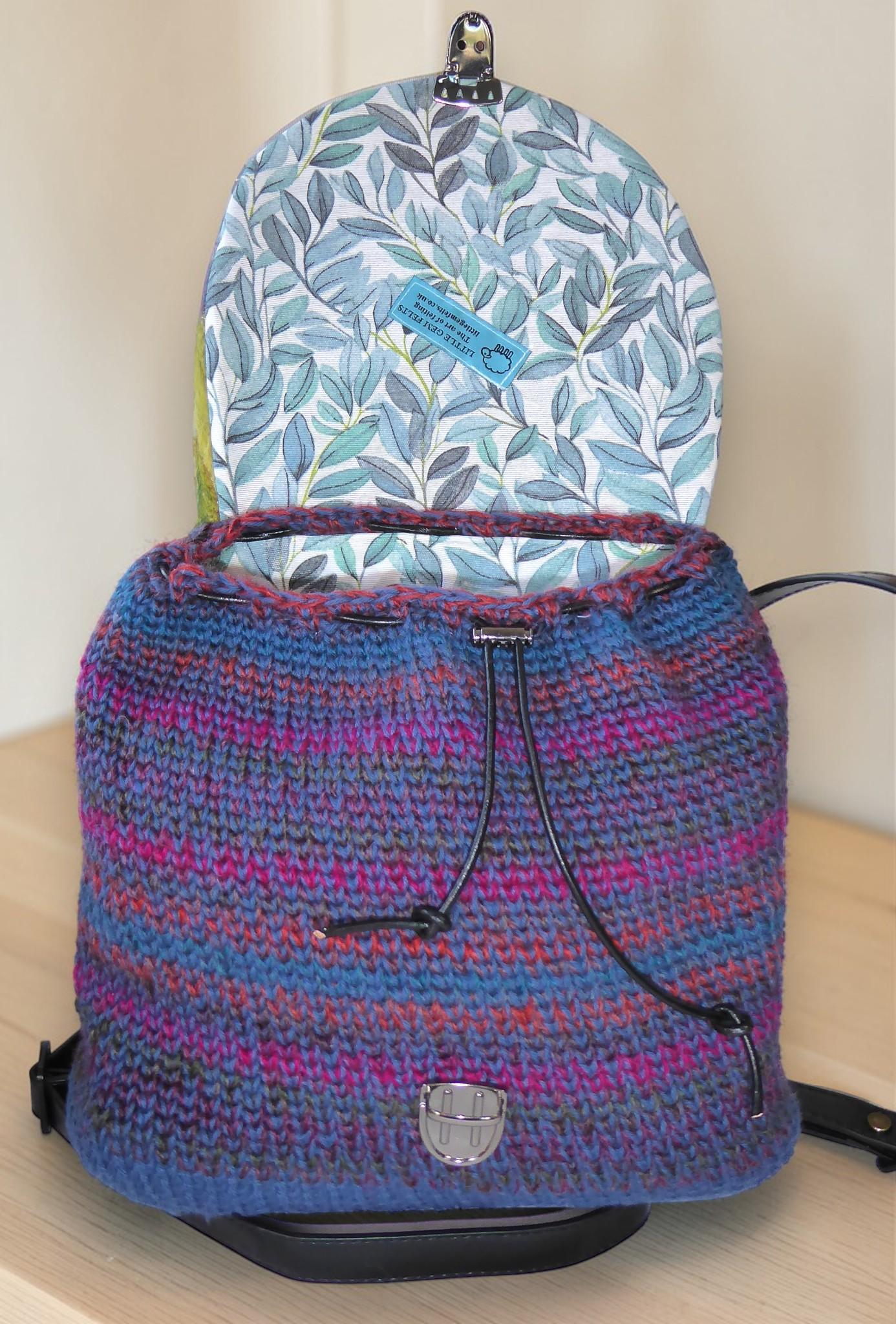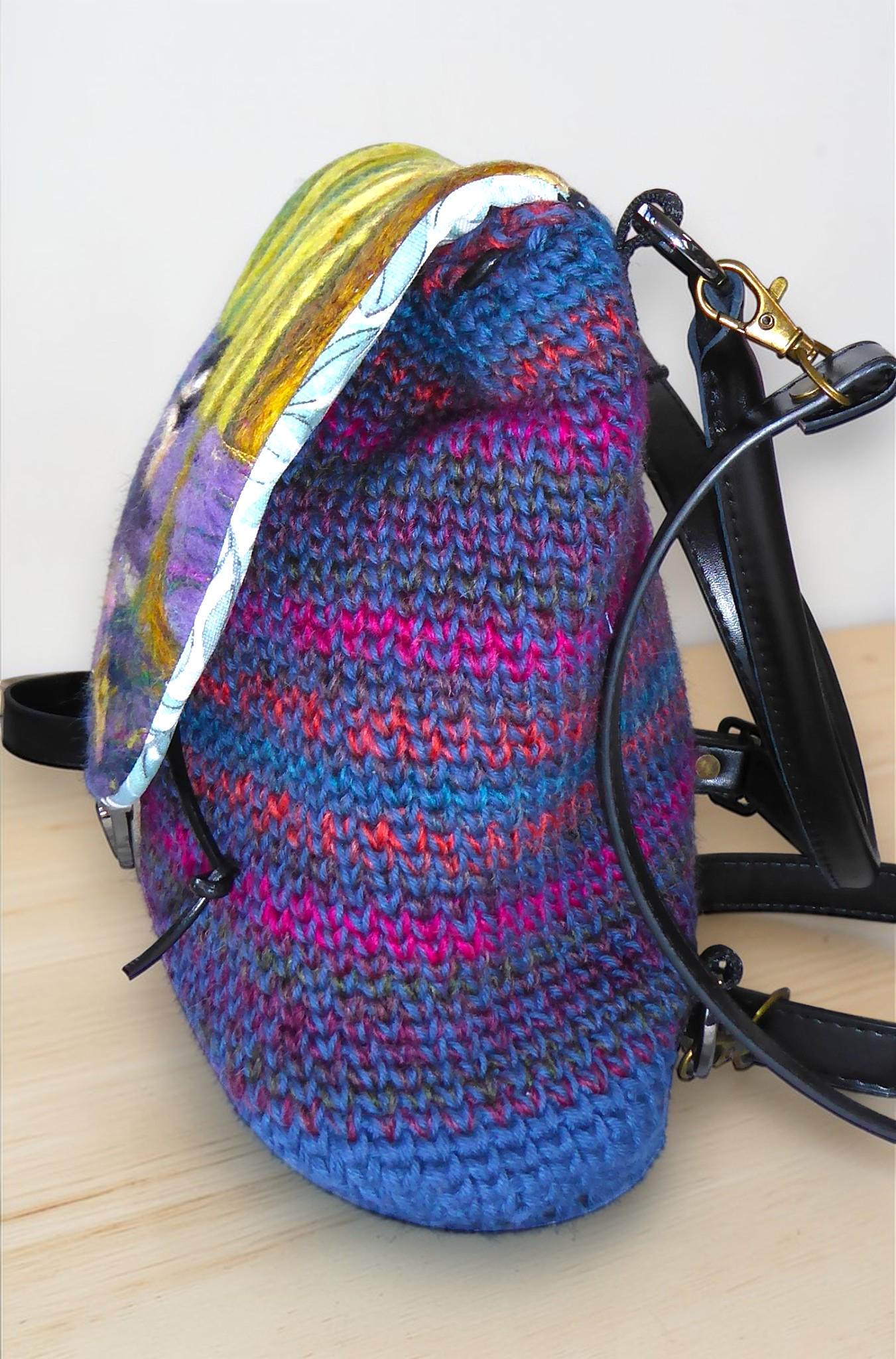 The body is crocheted cotton with a base and feet to protect the back-pack when you put it down.